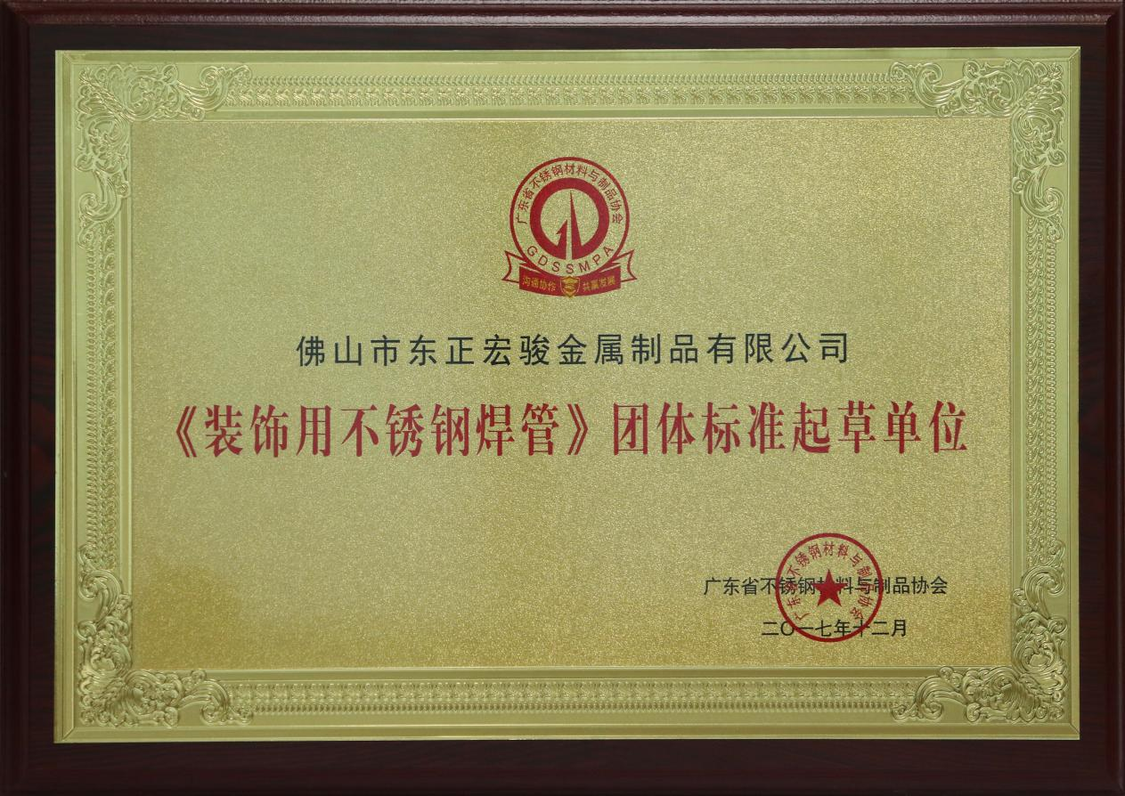 鑒于泓冠不銹鋼一直以來的品質(zhì)堅(jiān)持,在行業(yè)中已經(jīng)樹立起品牌名氣,行業(yè)協(xié)會(huì)多年來聘任東正宏駿為《裝飾用不銹鋼焊管》團(tuán)體標(biāo)準(zhǔn)起草單位職位。這是對泓冠不銹鋼的品質(zhì)形象的認(rèn)可,對泓冠不銹鋼來說也是一種特殊的榮譽(yù)。